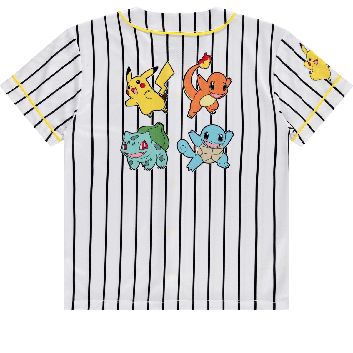 - Iconic Pokémon Design: Features Pikachu, Charizard, Squirtle, and Bulbasaur, beloved characters from the Pokémon universe, prominently displayed on a Pokemon baseball jersey shirt.