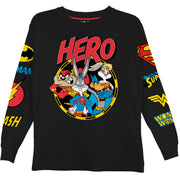 - DC Comics & Looney Tunes Fusion – Let your child showcase their love for superheroes and classic cartoons with this vibrant long sleeve t-shirt featuring Bugs Bunny as Superman, Tasmanian Devil as Batman, and Lola Bunny as Wonder Woman.