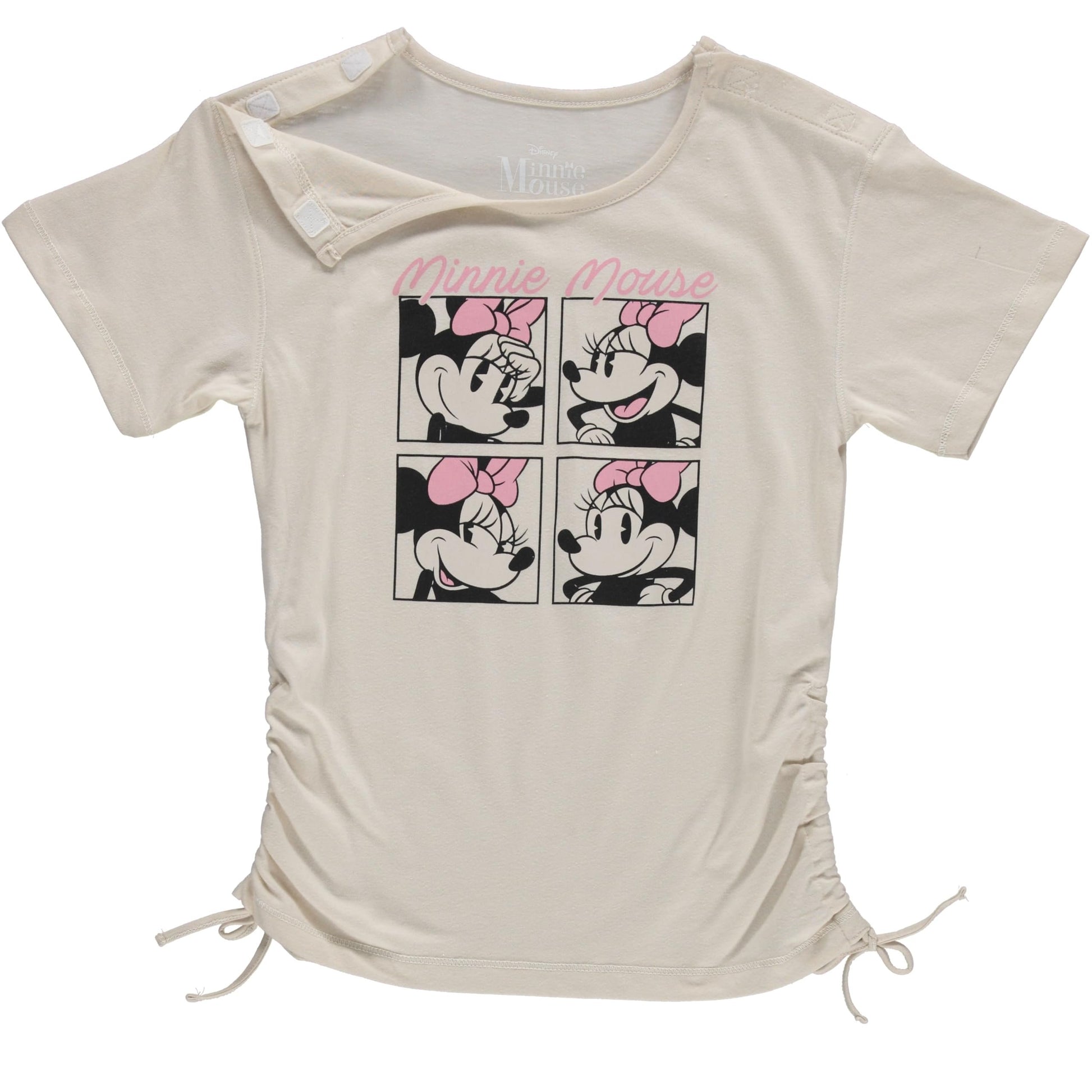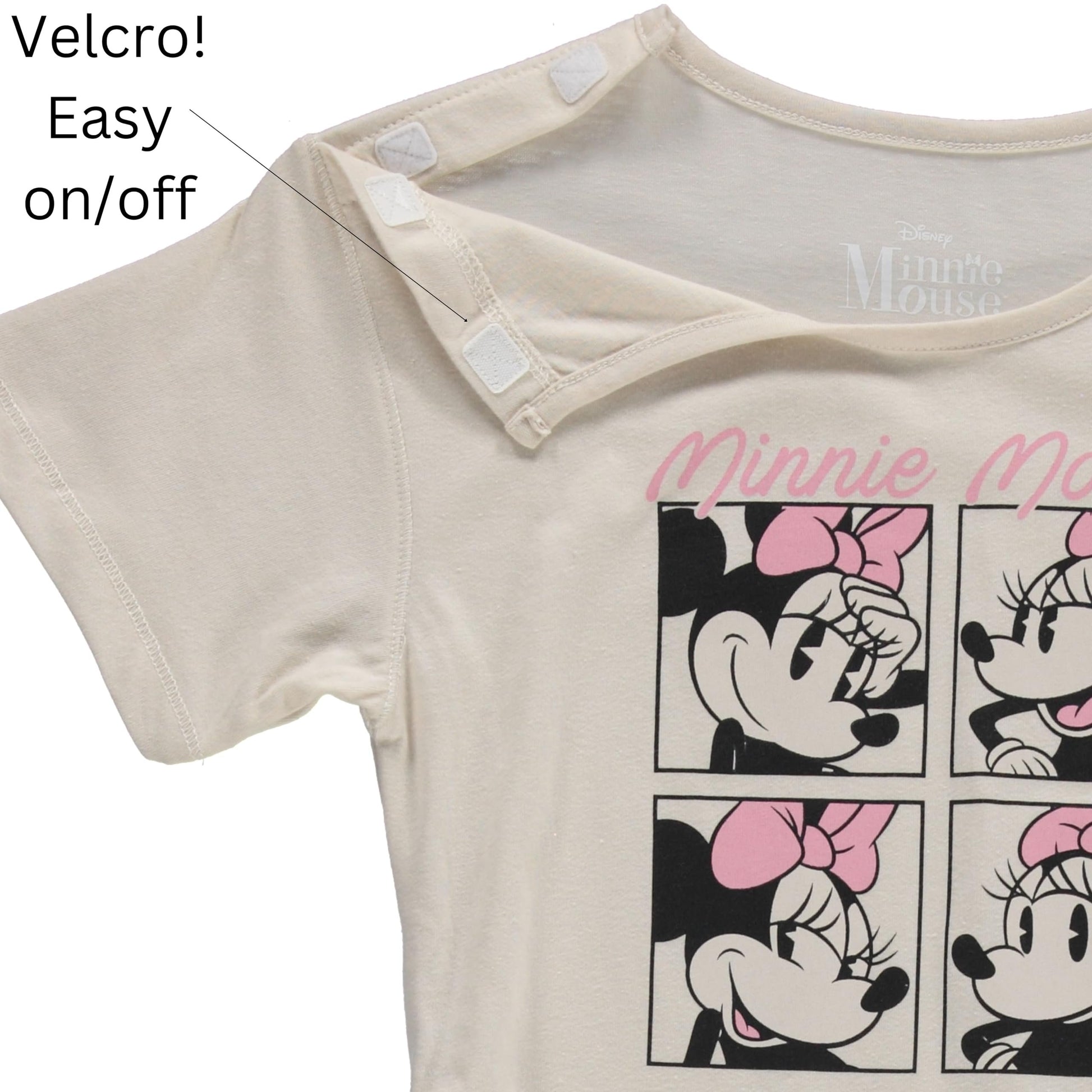 Adaptive Velcro Shoulder Opening: The Minnie Mouse T-shirt includes a Velcro shoulder opening, allowing for easy dressing without needing to pull it over the head.