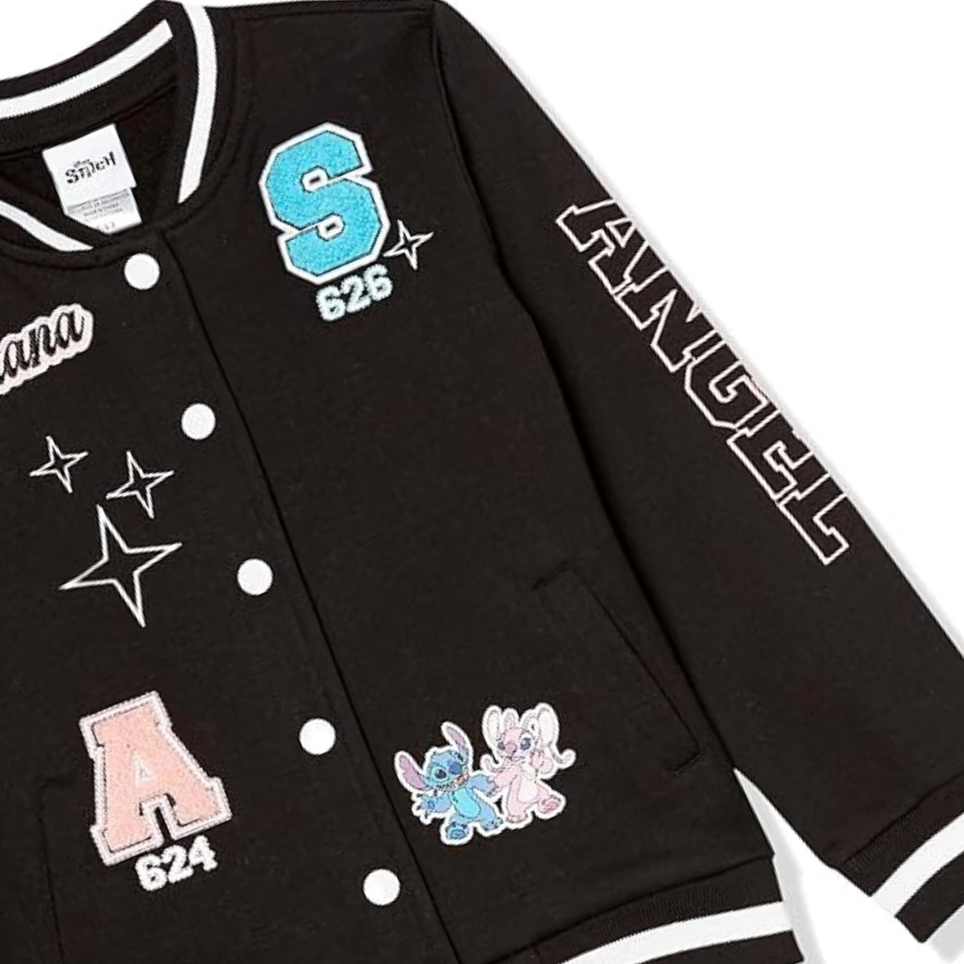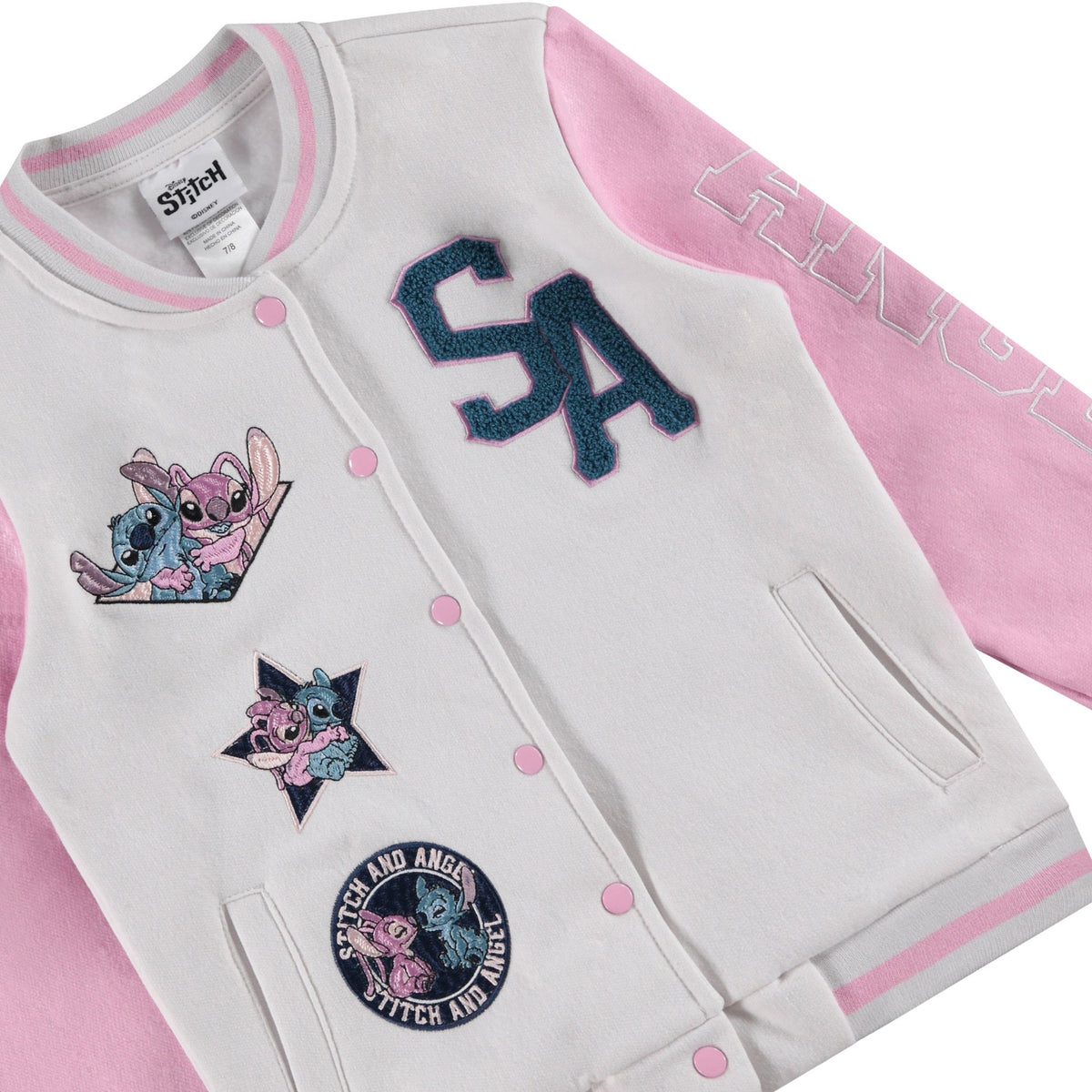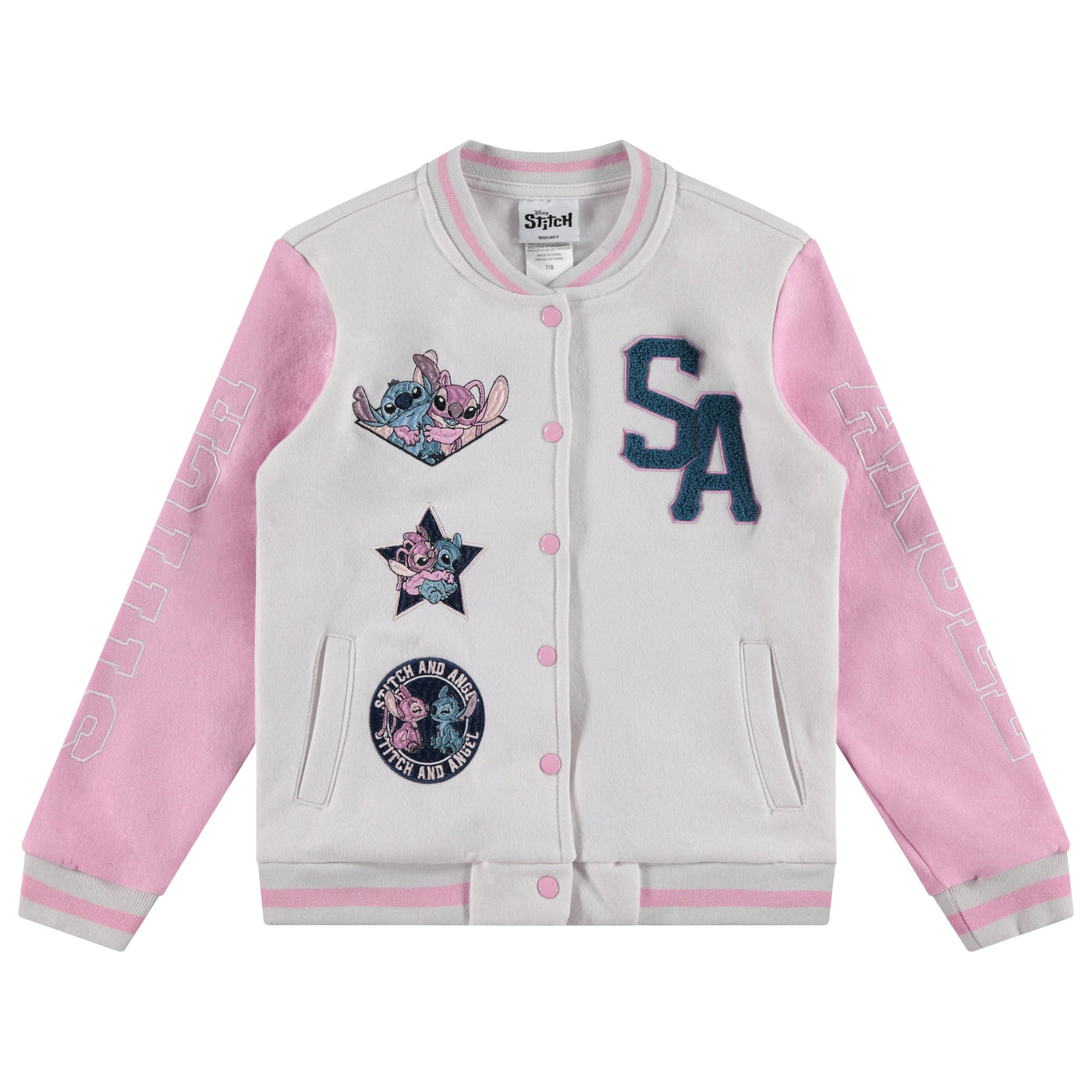 This Disney Lilo, Stitch & Angel Varsity Bomber Jacket, available in little and big girl sizes 4-16, brings playful style and comfort to any outfit. Crafted from a premium blend of 60% cotton and 40% polyester, this jacket combines soft fleece for cozy warmth with durability to withstand active play. With a classic snap closure, it’s easy to wear and adds a fun, sporty twist to any look. Adorned with colorful Lilo, Stitch, and Angel Embroidery Chenille patches along with vibrant graphics on both the front and back, this officially licensed Disney jacket celebrates the spirit of friendship and adventure embodied by these beloved characters. Perfect for school days, playdates, or simply making a statement, this jacket lets girls show off their love for Lilo, Stitch, and Angel in style. Available in multiple sizes—from XS (4/5) to XL (14/16)—this varsity bomber is a charming addition to any young Disney fan’s wardrobe.