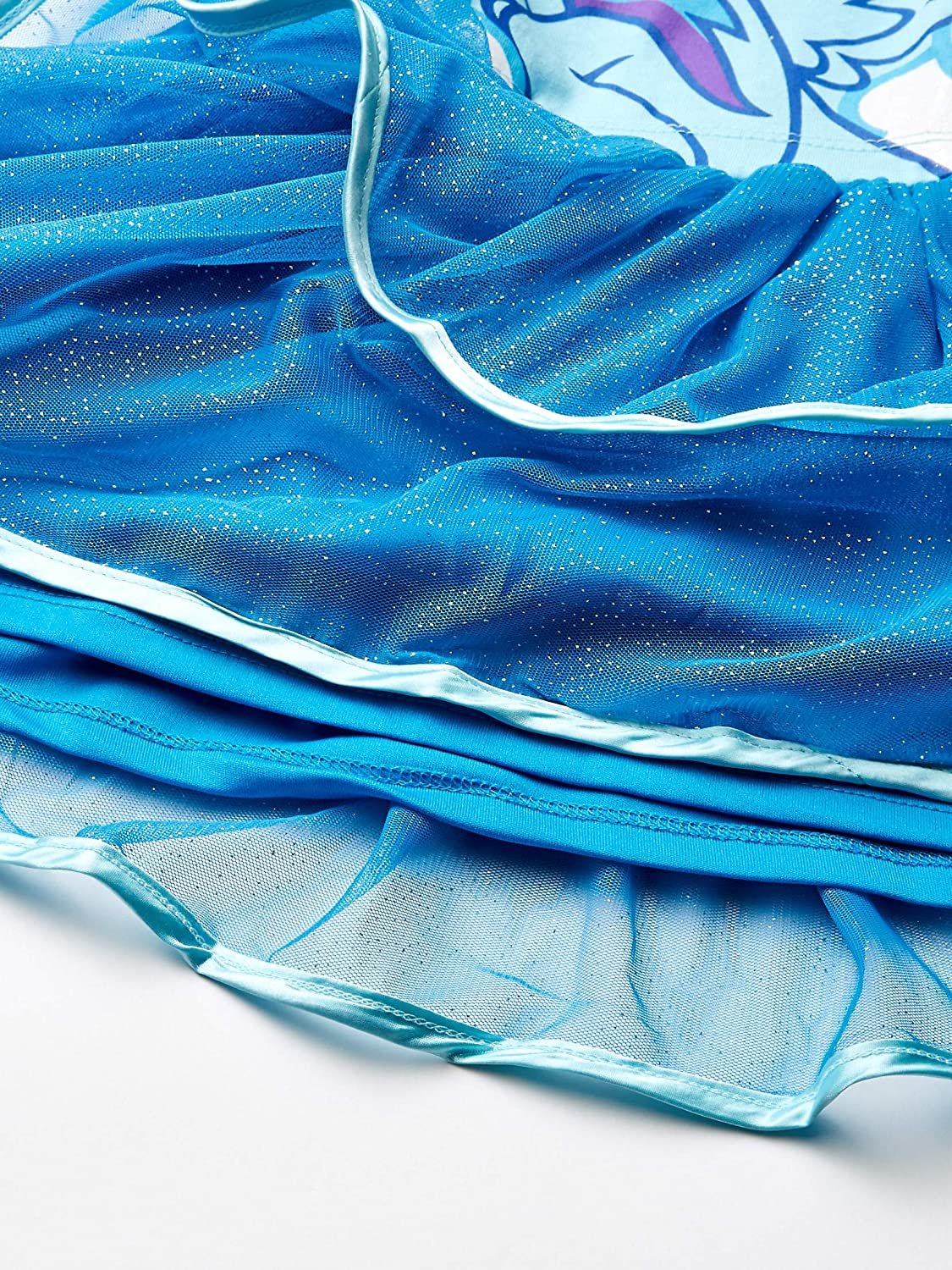 Your little one will never want to take off this adorable rainbow dash graphic costume dress. This dress features a hood with ears, a ruffled skirt, rainbow dash printed on the front and wings printed on the back. Silver glitter completes this awesome dress.